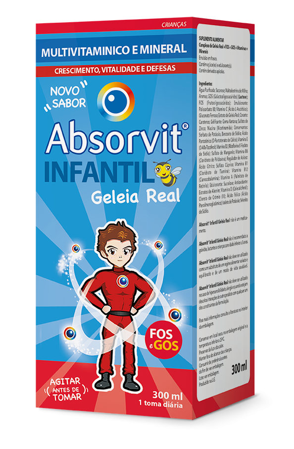 Absorvit Infantil Geleia Real 300ml, contém prebióticos, FOS e GOS. Com a finalidade de aumentarem a capacidade do organismo para absorver os minerais e sintetizar vitaminas. Ainda assim ajudam a regular o trânsito intestinal e contribuem para o reforço do sistema imunitário.