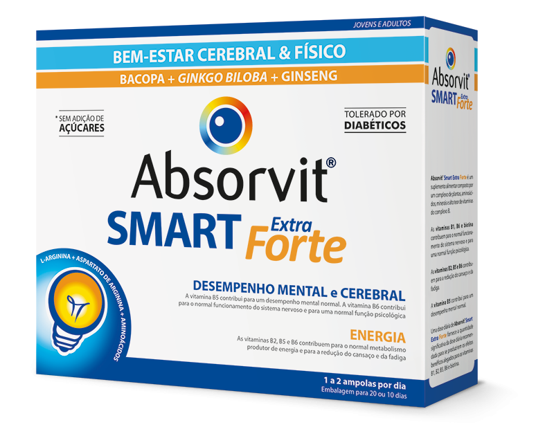 Absorvit® Smart Extra Forte é um suplemento alimentar composto por um complexo de plantas, aminoácidos, minerais e alto teor de vitaminas do complexo B. A vitamina B5 contribui para um desempenho mental normal.