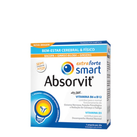 Absorvit® Smart Extra Forte é um suplemento alimentar composto por um complexo de plantas, aminoácidos, minerais e alto teor de vitaminas do complexo B. A vitamina B5 contribui para um desempenho mental normal.