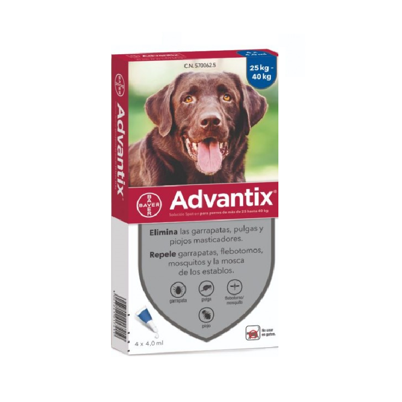 Medicamento veterinário, para cães com mais de 25 Kg, indicado no tratamento e prevenção de infestações por pulgas, piolhos mastigadores e carraças.