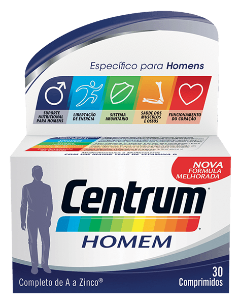 Centrum Homem é uma fórmula específica de vitaminas e minerais para homem. Por exemplo, as Vitaminas do complexo B e o Magnésio, têm um papel essencial na manutenção das funções do organismo dos homens: