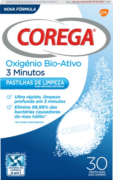 Corega Pastilhas de Limpeza Oxigénio Bio-Ativo. Limpeza profunda em 3 minutos. Elimina 99% das bactérias causadoras do mau hálito*. *em testes laboratoriaisCorega Pastilhas de Limpeza Oxigénio Bio-Ativo proporciona uma limpeza em 3 minutos. Elimina 99,9% das bactérias causadoras do mau hálito*. Para próteses dentárias e aparelhos ortodônticos. *em testes laboratoriais