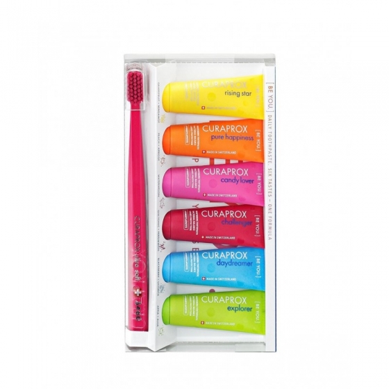 Kit constituído por seis pastas dentífricas e uma escova de dentes com cerdas ultra macias.