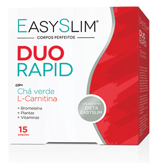 EASYSLIM® DUO RAPID é um suplemento alimentar que na sua composição contém um complexo fitoativo com Chá verde, L-Carnitina, Bromelaína, Bétula, Cerejeira, Groselheira negra, Taráxaco, Castanha-da-Índia, Rainha- dos-prados, Videira e Vitaminas. A Vitamina C contribui para a normal formação de colagénio para o funcionamento normal dos vasos sanguíneos.