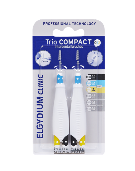 ELGYDIUM CLINIC ESCOVILHÃO TRIO COMPACT é o único sistema compacto e prático que combina três escovilhões num único cabo. Disponível em seis tamanhos diferentes. Cada tamanho tem uma cor correspondente, com diâmetro de arame específico (entre 0,38 e 0,80 mm) e diâmetro de cerdas específico (entre 1,9 e 8 mm) para se adaptar a todos os tamanhos dos espaços interdentários. Cinco versões disponíveis com uma escolha de escovilhões de um único tamanho ou mistos, com vários tamanhos.Têm ainda cerdas bicolores: brancas para revelar as gengivas sensíveis em caso de sangramento, e pretas, mais finas, para facilitar a inserção da escova e visualizar a eliminação da placa bacteriana.
