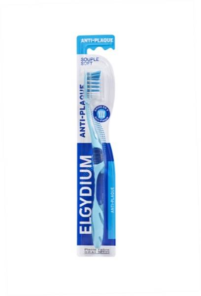 ELGYDIUM ANTI-PLACA é uma escova de dentes com cerdas laterais cruzadas em X .