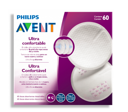 Os discos de amamentação descartáveis Philips Avent ajudam no processo de amamentação. A textura tipo favo de mel, o centro fino extremamente absorvente e o design respirável à prova de derrames mantêm a secura e o conforto durante o dia e à noite.