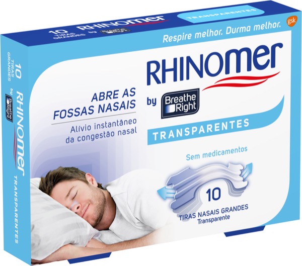 Tiras Nasais Rhinomer by Breathe Right. Abre as fossas nasais. Permite um alívio instantâneo da congestão nasal. Sem medicamentos. Ao abrirem as fossas nasais, as tiras nasais Rhinomer by Breathe Right melhoram o fluxo de ar, permitindo um alívio instantâneo da congestão nasal. As tiras nasais Rhinomer by Breathe Right não contêm medicamentos e está clinicamente comprovado que ao abrirem as fossas nasais permitem respirar 31% mais de ar. As tiras Rhinomer by Breathe Right são duas bandas plásticas flexíveis patenteadas. O adesivo especial permite que a tira se ajuste comodamente sobre as abas do nariz e a sua ação de flexão permite que as bandas elevem as fossas nasais abrindo e mantendo os canais nasais abertos. As tiras Rhinomer by Breathe Right podem ser usadas de dia ou à noite para o alívio de congestão nasal, devido a alergias, constipações, ressonar, ou desvio do septo, mas não devem ser usadas mais de 12h por dia.
