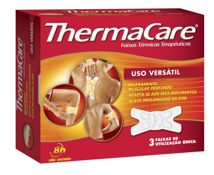 1. Não abra a saqueta se não for utilizar ThermaCare®. ThermaCare® pode demorar até 30 minutos a atingir a temperatura terapêutica desejada. 2. Coloque a faixa sobre a área a tratar, com o lado mais escuro das células térmicas voltado para a pele e ajuste a faixa fechando-a à frente. Se tem 55 anos ou mais, utilize ThermaCare® sobre uma camada de roupa e não directamente sobre a pele. 3. Para maior eficácia, recomendamos que utilize ThermaCare® durante 8 horas.