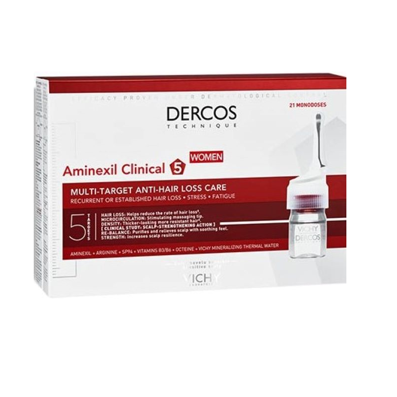 VICHY Dercos Aminexil Clinical 5 - Mulher é um cuidado antiqueda multiativo intensivo, para mulheres com queda de cabelo. Uma fórmula concebida para atuar nas 5 causas de queda de cabelo, com: